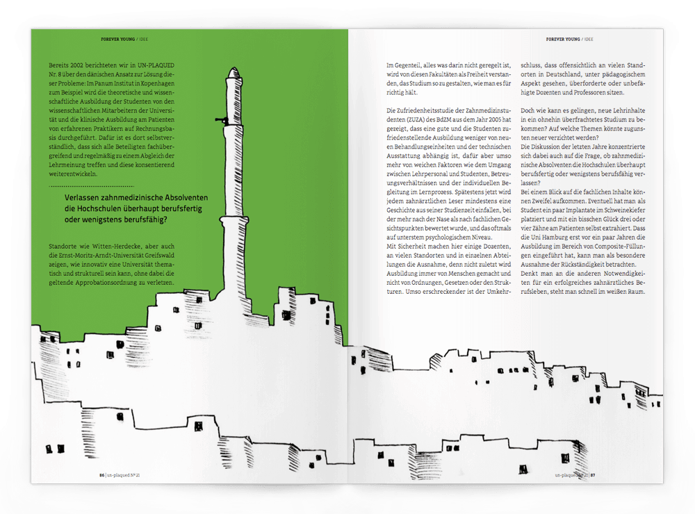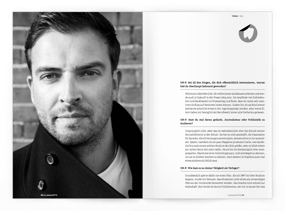Das „Magazin für Mensch und Bildung“ richtet sich zwar in erster Linie an Zahnärzte, allerdings mit einem universellen Themenspektrum. Jede der umfangreichen, hochwertig gedruckten Ausgaben widmet sich einem Thema. Worldoptimizer konzipiert (mit dem Herausgeber) und gestaltet, illustriert, fotografiert.